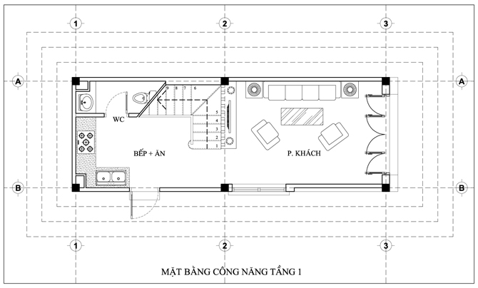 Tầng 1: vệ sinh sẽ bố trí dưới gầm thang để tận dụng không gian bếp. Phòng khách sẽ là không gian rộng, hành lang mở cửa sổ lấy sáng cũng là trang trí cho mặt bên của nhà.